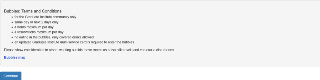 As a member of the Geneva Graduate Institute community, you can book our “Bubbles” (study rooms) for individual or team work. The self-service booking system is not complicated, but requires some explanations of rules and procedure.