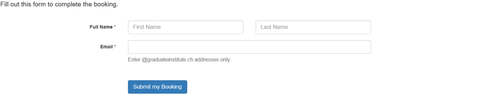 8. Fill out the remaining fields in the form to complete your booking: first name, last name and email address. Only @graduateinstitute.ch email addresses are accepted. Then, click on “Submit my booking“: