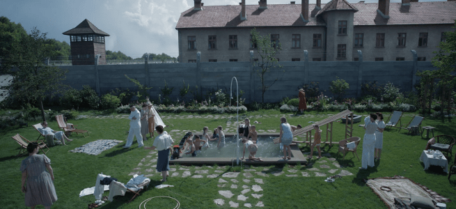 Sound precedes image: birds squawking, a metallic rage, vocalisations from deep within. The black screen is as insistent as the preamble to Michael Haneke’s The White Ribbon. Whispers rise in the audience to counteract the discomfort. Then, the sun illuminates the blond braids and half-naked bodies of the family by the water. Life seems so peaceful. The next day, after receiving his birthday present, the father, dressed in a Nazi uniform, leaves for work. A few metres away from the house, a reverse shot reveals the watchtowers of Auschwitz.